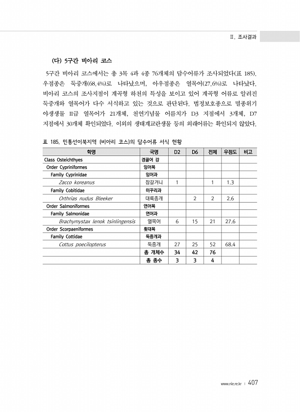 Ⅱ. 조사결과 www.nie.re.kr ? 407 다 5구간 비아리 코스 5구간 비아리 코스에서는 총 3목 4과 4종 76개체의 담수어류가 조사되었다 표 185 우점종은 둑중개 68.4% 로 나타났으며, 아우점종은 열목어 27.6% 로 나타났다. 비아리 코스의 조사지점이 계곡형 하천의 특성을 보이고 있어 계곡형 어류로 알려진 둑중개와 열목어가 다수 서식하고 있는 것으로 판단된다. 법정보호종으로 멸종위기 야생생물 II급 열목어가 21개체, 천연기념물 어름치가 D3 지점에서 3개체, D7 지점에서 30개체 확인되었다. 이외의 생태계교란생물 등의 외래어류는 확인되지 않았다. 표 185. 민통선이북지역 비아리 코스 의 담수어류 서식 현황 학명 국명 D2 D6 전체 우점도 비고 Class Osteichthyes 경골...
