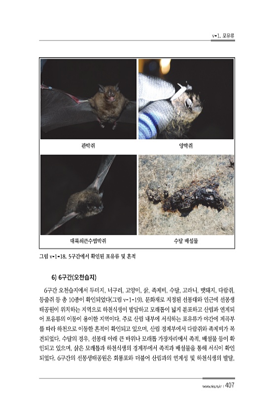 v-1. 포유류 www.nie.re.kr ?407 관박쥐 양박쥐 대륙쇠큰수염박쥐 수달 배설물 그림 v-1-18. 5구간에서 확인된 포유류 및 흔적 6 6 6구간 오천습지에서 두더지, 너구리, 고양이, 삵, 족제비, 수달, 고라니, 맷돼지, 다람쥐, 등줄쥐 등 총 10종이 확인되었다 그림 v-1-19 문화재로 지정된 선몽대와 인근에 선몽생 태공원이 위치하는 지역으로 하천식생이 발달하고 모래톱이 넓게 분포하고 산림과 연계되 어 포유류의 이동이 용이한 지역이다. 주로 산림 내부에 서식하는 포유류가 야간에 계곡부 를 따라 하천으로 이동한 흔적이 확인되고 있으며, 산림 경계부에서 다람쥐와 족제비가 목 견되었다. 수달의 경우, 선몽대 아래 큰 바위나 모래톱 가장자리에서 족적, 배설물 등이 확 인되고 있으며, 삵은 모래...