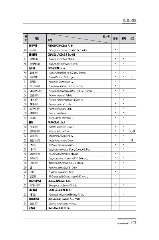 II. 조사결과 www.nie.re.kr ?403 번 호 국명 도서명 학명 문헌 현지 비고 돈나무과 PITTOSPORACEAE R. Br. 46 돈나무 Pittosporum tobira Thunb. W.T. Aiton * Ⅰ 돌나물과 CRASSULACEAE J. St.-Hil. 47 땅채송화 Sedum oryzifolium Makino * * 48 바위채송화 Sedum polytrichoides Hemsl. * * 장미과 ROSACEAE Juss. 49 팥배나무 Aria alnifolia Siebold & Zucc. Decne. * * 50 솜양지꽃 Potentilla discolor Bunge * * LC 51 양지꽃 Potentilla fragarioides L. * 52 윤노리나무 Pourthiaea ...
