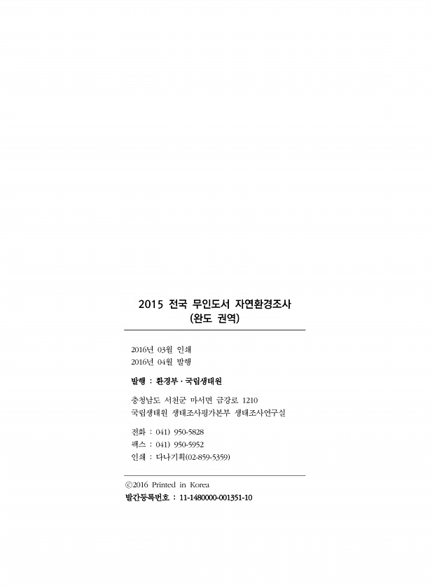 2015 전국 무인도서 자연환경조사 완도 권역 2016년 03월 인쇄 2016년 04월 발행 발행 환경부·국립생태원 충청남도 서천군 마서면 금강로 1210 국립생태원 생태조사평가본부 생태조사연구실 전화 041 950-5828 팩스 041 950-5952 인쇄 다나기획 02-859-5359 ⓒ2016 Printed in Korea 발간등록번호 11-1480000-001351-10