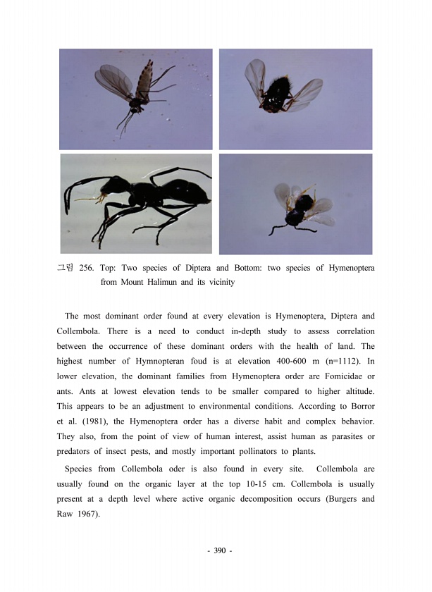 390 256. TopTwo species of Diptera and Bottomtwo species of Hymenoptera from Mount Halimun and its vicinity The most dominant order found at every elevation is Hymenoptera, Diptera and Collembola. There is a need to conduct in-depth study to assess correlation between the occurrence of these dominant orders with the health of land. The highest number of Hymnopteran foud is at elevation 400-600 m n...