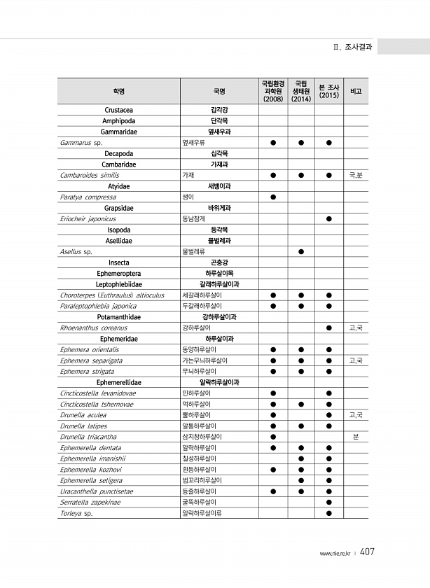 Ⅱ. 조사결과 www.nie.re.kr ? 407 학명 국명 국립환경 과학원 2008 국립 생태원 2014 본 조사 2015 비고 Crustacea 갑각강 Amphipoda 단각목 Gammaridae 옆새우과 Gammarus sp. 옆새우류 ● ● ● Decapoda 십각목 Cambaridae 가재과 Cambaroides similis 가재 ● ● ● 국,분 Atyidae 새뱅이과 Paratya compressa 생이 ● Grapsidae 바위게과 Eriocheir japonicus 동남참게 ● Isopoda 등각목 Asellidae 물벌레과 Asellus sp. 물벌레류 ● Insecta 곤충강 Ephemeroptera 하루살이목 Leptophlebiidae 갈래하루살이과 Choroterpes Euthra...