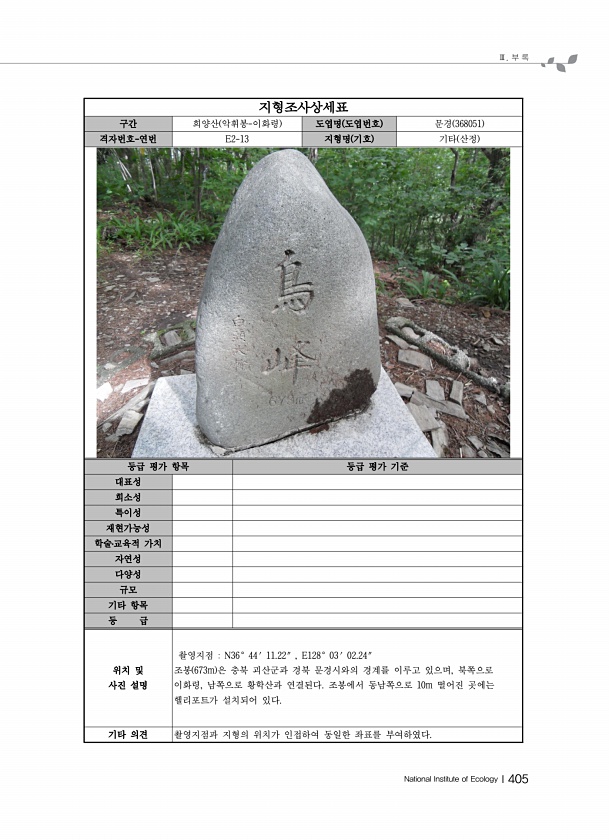 Ⅲ. 부 록 National Institute of EcologyⅠ405 지형조사상세표 구간 희양산 악휘봉-이화령 도엽명 도엽번호 문경 368051 격자번호-연번 E2-13 지형명 기호 기타 산정 등급 평가 항목 등급 평가 기준 대표성 희소성 특이성 재현가능성 학술?교육적 가치 자연성 다양성 규모 기타 항목 등 급 위치 및 사진 설명 촬영지점 N36° 44′ 11.22″ , E128° 03′ 02.24″ 조봉 673m 은 충북 괴산군과 경북 문경시와의 경계를 이루고 있으며, 북쪽으로 이화령, 남쪽으로 황학산과 연결된다. 조봉에서 동남쪽으로 10m 떨어진 곳에는 헬리포트가 설치되어 있다. 기타 의견 촬영지점과 지형의 위치가 인접하여 동일한 좌표를부여하였다.