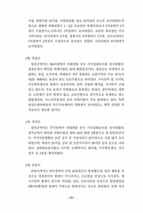 지점, 달맞이꽃 35지점, 서양민들레, 망초 23지점의 순으로 조사되었다.목 본으로 생태계 위해성평가 1?2급 유보종인 족제비싸리가 5지점에서 2지 점이 우점종이고,가죽나무 3지점에서 조사되었다. 초본의 후보종인 미국 가막사리는 27지점에서 6지점, 뚱딴지는 8지점에서 1지점, 큰도꼬마리는 3지점에서 2지점이 우점종으로 분포하고 있었다. 큰김의털은 8지점에서 조사되었다. 뱌 청송군 청송군에서는 106지점에서 외래생물 전국 서식실태조사를 실시하였다. 청송군에서 확인된 외래식물은 16과 55분류군이다. 청송군은 국내에서 손 꼽히는 청정, 오지이며, 외래종이 자주 출몰하는 교란지역은 주로 과수 사 과 를 재배하는 농경지 또는 도로주변으로 파악된다. 가시상추 및 가시박, 미국쑥부쟁이의 발생이 인상적이며, 일부 지점...