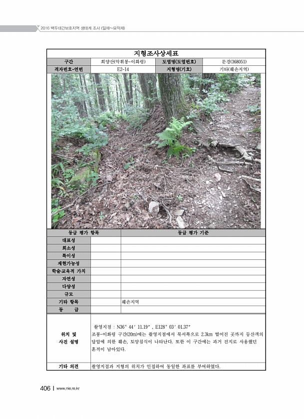 2016 백두대간보호지역 생태계 조사 밀재묘적재 406Ⅰwww.nie.re.kr 지형조사상세표 구간 희양산 악휘봉-이화령 도엽명 도엽번호 문경 368051 격자번호-연번 E2-14 지형명 기호 기타 훼손지역 등급 평가 항목 등급 평가 기준 대표성 희소성 특이성 재현가능성 학술?교육적 가치 자연성 다양성 규모 기타 항목 훼손지역 등 급 위치 및 사진 설명 촬영지점 N36° 44′ 11.19″ , E128° 03′ 01.37″ 조봉이화령 구간 20m 에는 촬영지점에서 북서쪽으로 2.3km 떨어진 곳까지 등산객의 답압에 의한 훼손, 토양침식이 나타난다. 또한 이 구간에는 과거 진지로 사용했던 흔적이 남아있다. 기타 의견 촬영지점과 지형의 위치가 인접하여 동일한 좌표를부여하였다.