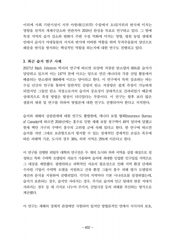이외에 사회 기반시설이 서부 아한대 亞寒帶 수림에서 오리/거위의 번식에 미치는 영향을 천적의 개체수감소와 연관지어 2019년 완성을 목표로 연구하고 있다. 그 밖에 특정 지역의 습지 감소와 변화가 주변 수질 악화에 미치는 영향, 평원 농업 생태계 안에서 습지가 야생동물의 서식과 번식에 어떠한 역할을 하며 무척추동물의 양산으로 해충을 번식을 방지하는 핵심적인 역할을 하는지에 대한 연구도 진행되고 있다. 3. 최근 습지 연구 사례 2017년 Mark Johnston 박사의 연구에 따르면 토양에 저장된 탄소량의 60%를 습지가 담당하고 있으며 이는 147억 톤에 이르는 양으로 연간 캐나다의 각종 산업 활동에서 배출되는 탄소량의 900배에 이르는 양이라고 한다. 이 연구에서 특히 강조하는 바는 수십 년간의 연구를 ...