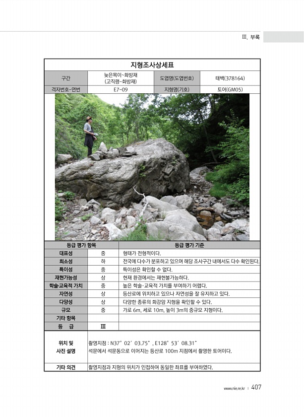 Ⅲ. 부록 www.nie.re.kr ? 407 지형조사상세표 구간 늦은목이화방재 고직령-화방재 도엽명 도엽번호 태백 378164 격자번호-연번 E7-09 지형명 기호 토어 GM05 등급 평가 항목 등급 평가 기준 대표성 중 형태가 전형적이다. 희소성 하 전국에 다수가 분포하고 있으며 해당 조사구간 내에서도 다수 확인된다. 특이성 중 특이성은 확인할 수 없다. 재현가능성 상 현재 환경에서는 재현불가능하다. 학술?교육적 가치 중 높은 학술·교육적 가치를 부여하기 어렵다. 자연성 상 등산로에 위치하고 있으나 자연성을 잘 유지하고 있다. 다양성 상 다양한 종류의 화강암 지형을 확인할 수 있다. 규모 중 가로 6m, 세로 10m, 높이 3m의 중규모 지형이다. 기타 항목 등 급 Ⅲ 위치 및 사진 설명 촬영지점 N37...