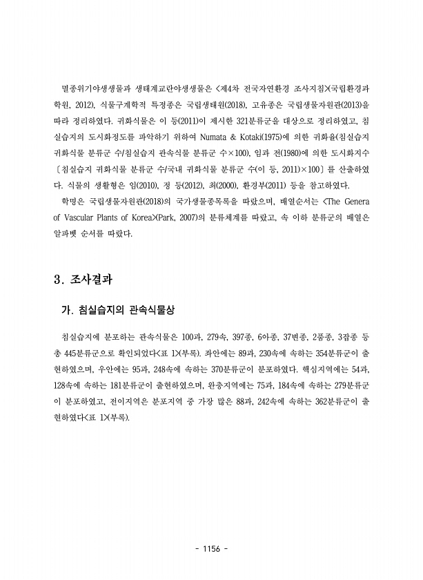 1156 멸종위기야생생물과 생태계교란야생생물은 제4차 전국자연환경 조사지침 국립환경과 학원, 2012 , 식물구계학적 특정종은 국립생태원 2018 , 고유종은 국립생물자원관 2013 을 따라 정리하였다. 귀화식물은 이 등 2011 이 제시한 321분류군을 대상으로 정리하였고, 침 실습지의 도시화정도를 파악하기 위하여 Numata & Kotaki 1975 에 의한 귀화율 침실습지 귀화식물 분류군 수/침실습지 관속식물 분류군 수×100 , 임과 전 1980 에 의한 도시화지수 〔침실습지 귀화식물 분류군 수/국내 귀화식물 분류군 수 이 등, 2011 ×100〕를 산출하였 다. 식물의 생활형은 임 2010 , 정 등 2012 , 최 2000 , 환경부 2011 등을 참고하였다. 학명은 국립생물자원관 2018 의 국...