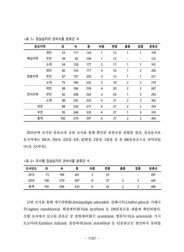 1157 분포지역 과 속 종 아종 변종 품종 잡종 분류군 핵심지역 좌안 53 117 143 1 13 1 1 159 우안 39 92 109 1 12 122 소계 54 128 177 2 17 1 1 181 완충지역 좌안 60 143 177 4 16 1 2 200 우안 67 157 203 3 13 1 1 221 소계 75 184 252 5 18 2 2 279 전이지역 좌안 68 186 239 4 20 2 2 267 우안 82 208 263 3 24 1 3 293 소계 88 242 323 4 31 2 3 362 좌안 89 230 317 6 27 2 2 354 우안 95 248 335 4 27 1 3 370 총계 100 279 397 6 37 2 3 445 표 1 침실습지의 관속식물 분류군 수 2015년에 조사된 분...