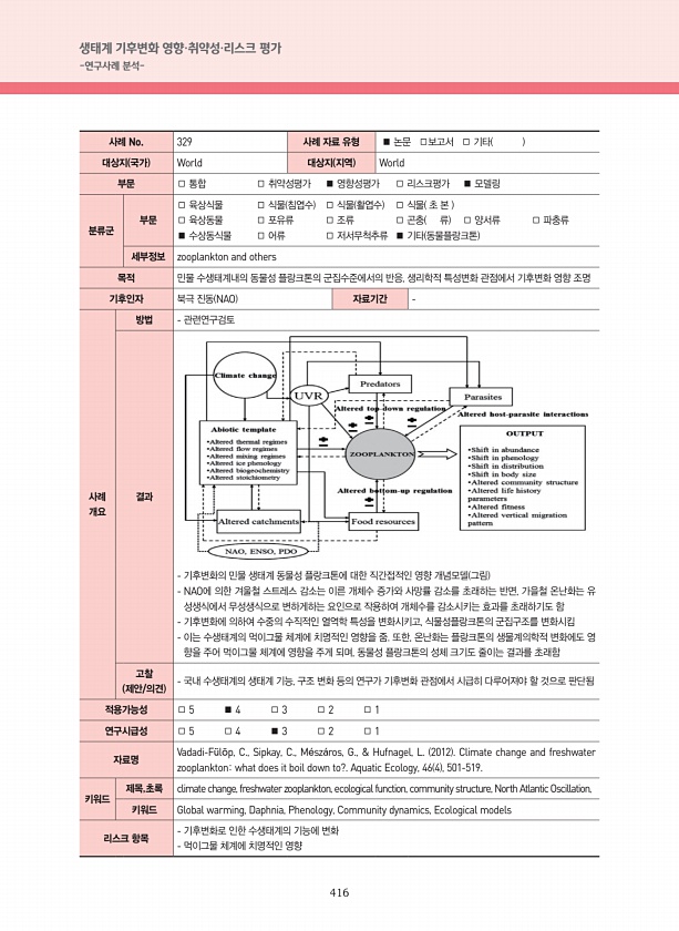 416 생태계 기후변화 영향·취약성·리스크 평가 -연구사례 분석- 사례 No. 329 사례 자료 유형 ■ 논문 □보고서 □ 기타 대상지 국가 World 대상지 지역 World 부문 □ 통합 □ 취약성평가 ■ 영향성평가 □ 리스크평가 ■ 모델링 분류군 부문 □ 육상식물 □ 식물 침엽수 □ 식물 활엽수 □ 식물 초 본 □ 육상동물 □ 포유류 □ 조류 □ 곤충 류 □ 양서류 □ 파충류 ■ 수상동식물 □ 어류 □ 저서무척추류 ■ 기타 동물플랑크톤 세부정보 zooplankton and others 목적 민물 수생태계내의 동물성 플랑크톤의 군집수준에서의 반응, 생리학적 특성변화 관점에서 기후변화 영향 조명 기후인자 북극 진동 NAO 자료기간 사례 개요 방법 관련연구검토 결과 기후변화의 민물 생태계 동물성 플랑크톤에 대...