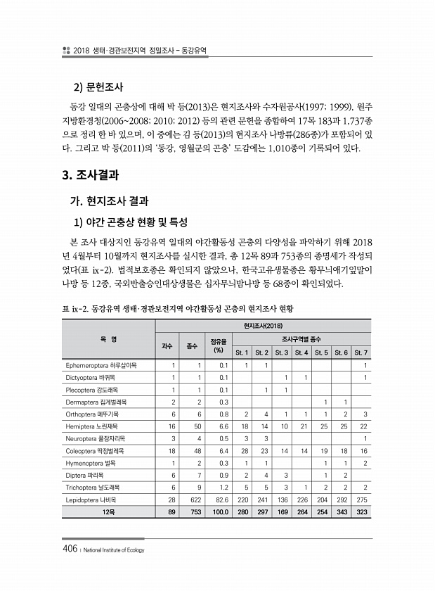 2018 생태·경관보전지역 정밀조사 동강유역 406 ? National Institute of Ecology 2 동강 일대의 곤충상에 대해 박 등 2013 은 현지조사와 수자원공사 1997; 1999 , 원주 지방환경청 20062008; 2010; 2012 등의 관련 문헌을 종합하여 17목 183과 1,737종 으로 정리 한 바 있으며, 이 중에는 김 등 2013 의 현지조사 나방류 286종 가 포함되어 있 다. 그리고 박 등 2011 의 ‘동강, 영월군의 곤충’ 도감에는 1,010종이 기록되어 있다. 3. 1 본 조사 대상지인 동강유역 일대의 야간활동성 곤충의 다양성을 파악하기 위해 2018 년 4월부터 10월까지 현지조사를 실시한 결과, 총 12목 89과 753종의 종명세가 작성되 었다 표 ⅸ-2 법적보...