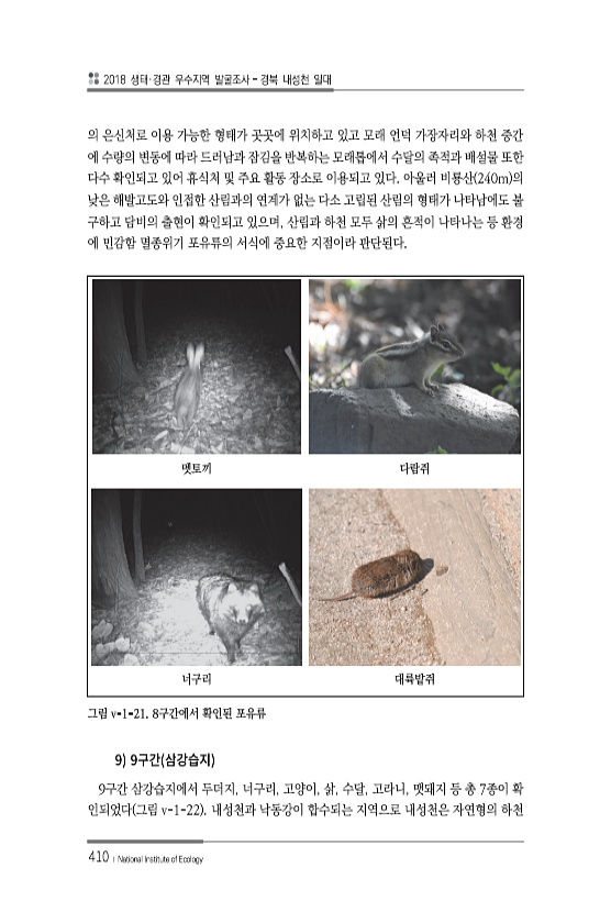 2018 생태·경관 우수지역 발굴조사 경북 내성천 일대 410 ? National Institute of Ecology 의 은신처로 이용 가능한 형태가 곳곳에 위치하고 있고 모래 언덕 가장자리와 하천 중간 에 수량의 변동에 따라 드러남과 잠김을 반복하는 모래톱에서 수달의 족적과 배설물 또한 다수 확인되고 있어 휴식처 및 주요 활동 장소로 이용되고 있다. 아울러 비룡산 240m 의 낮은 해발고도와 인접한 산림과의 연계가 없는 다소 고립된 산림의 형태가 나타남에도 불 구하고 담비의 출현이 확인되고 있으며, 산림과 하천 모두 삵의 흔적이 나타나는 등 환경 에 민감함 멸종위기 포유류의 서식에 중요한 지점이라 판단된다. 멧토끼 다람쥐 너구리 대륙밭쥐 그림 v-1-21. 8구간에서 확인된 포유류 9 9 9구간 삼강습지...