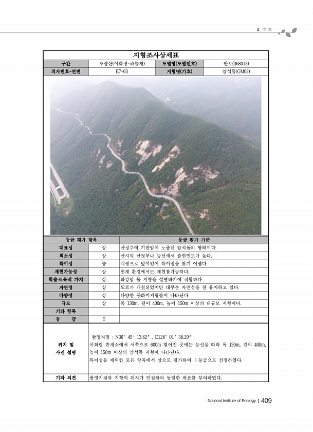 Ⅲ. 부 록 National Institute of EcologyⅠ409 지형조사상세표 구간 조령산 이화령-하늘재 도엽명 도엽번호 안보 368013 격자번호-연번 E7-03 지형명 기호 암석돔 GM02 등급 평가 항목 등급 평가 기준 대표성 상 산정부에 기반암이 노출된 암석돔의 형태이다. 희소성 상 산지의 산정부나 능선에서 출현빈도가 높다. 특이성 중 식생으로 덮여있어 특이점을 찾기 어렵다. 재현가능성 상 현재 환경에서는 재현불가능하다. 학술?교육적 가치 상 화강암 돔 지형을 설명하기에 적합하다. 자연성 상 도로가 개설되었지만 대부분 자연성을 잘 유지하고 있다. 다양성 상 다양한 풍화미지형들이 나타난다. 규모 상 폭 130m, 길이 400m, 높이 150m 이상의 대규모 지형이다. 기타 항목 등 급 Ⅰ 위치...