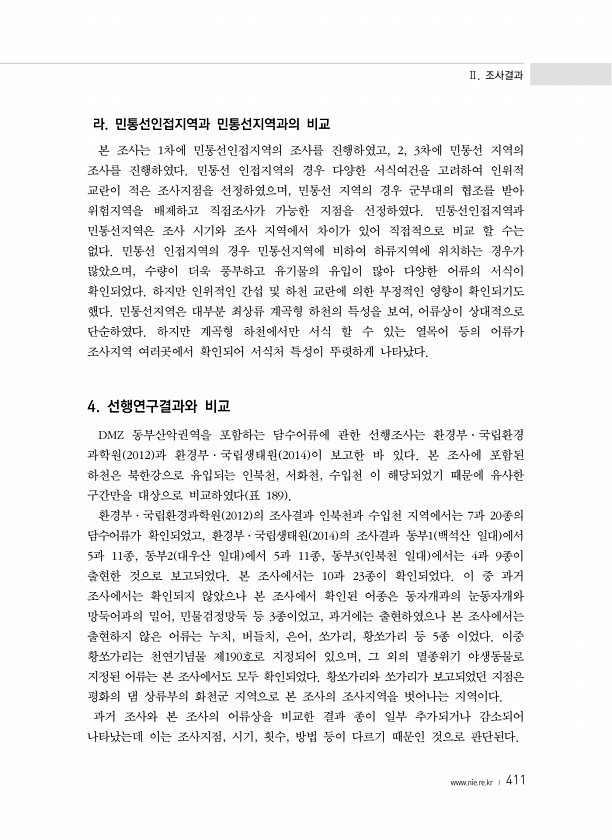 Ⅱ. 조사결과 www.nie.re.kr ? 411 라. 민통선인접지역과 민통선지역과의 비교 본 조사는 1차에 민통선인접지역의 조사를 진행하였고, 2, 3차에 민통선 지역의 조사를 진행하였다. 민통선 인접지역의 경우 다양한 서식여건을 고려하여 인위적 교란이 적은 조사지점을 선정하였으며, 민통선 지역의 경우 군부대의 협조를 받아 위험지역을 배제하고 직접조사가 가능한 지점을 선정하였다. 민통선인접지역과 민통선지역은 조사 시기와 조사 지역에서 차이가 있어 직접적으로 비교 할 수는 없다. 민통선 인접지역의 경우 민통선지역에 비하여 하류지역에 위치하는 경우가 많았으며, 수량이 더욱 풍부하고 유기물의 유입이 많아 다양한 어류의 서식이 확인되었다. 하지만 인위적인 간섭 및 하천 교란에 의한 부정적인 영향이 확인되기도 했다...