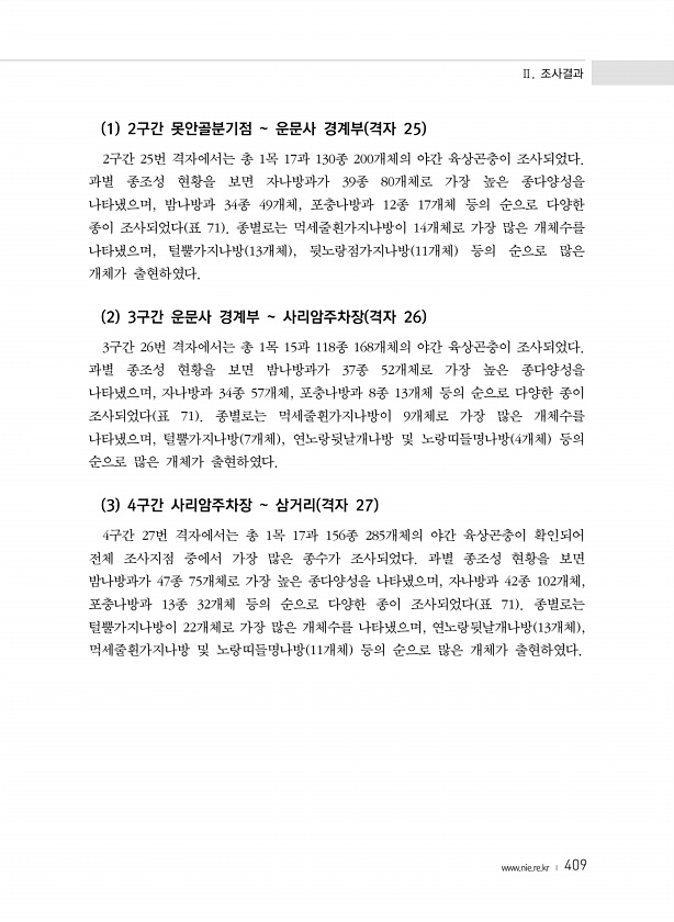 Ⅱ. 조사결과 www.nie.re.kr ? 409 1 2구간 못안골분기점 운문사 경계부 격자 25 2구간 25번 격자에서는 총 1목 17과 130종 200개체의 야간 육상곤충이 조사되었다. 과별 종조성 현황을 보면 자나방과가 39종 80개체로 가장 높은 종다양성을 나타냈으며, 밤나방과 34종 49개체, 포충나방과 12종 17개체 등의 순으로 다양한 종이 조사되었다 표 71 종별로는 먹세줄흰가지나방이 14개체로 가장 많은 개체수를 나타냈으며, 털뿔가지나방 13개체 , 뒷노랑점가지나방 11개체 등의 순으로 많은 개체가 출현하였다. 2 3구간 운문사 경계부 사리암주차장 격자 26 3구간 26번 격자에서는 총 1목 15과 118종 168개체의 야간 육상곤충이 조사되었다. 과별 종조성 현황을 보면 밤나방과가 37종 ...