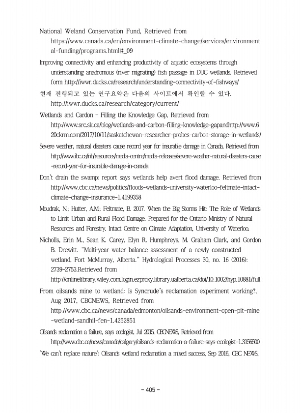 National Weland Conservation Fund, Retrieved from https//www.canada.ca/en/environment-climate-change/services/environment al-funding/programs.html#_09 Improving connectivity and enhancing productivity of aquatic ecosystems through understanding anadromous river migrating fish passage in DUC wetlands. Retrieved form http//iwwr.ducks.ca/research/understanding-connectivity-of-fishways/ 현재 진행되고 있는 연구요...