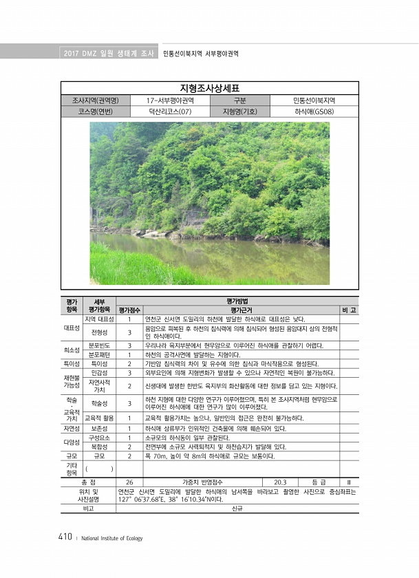 2017 DMZ 일원 생태계 조사 민통선이북지역 서부평야권역 410 ? National Institute of Ecology 지형조사상세표 조사지역 권역명 17-서부평야권역 구분 민통선이북지역 코스명 연번 덕산리코스 07 지형명 기호 하식애 GS08 평가 항목 세부 평가항목 평가방법 평가점수 평가근거 비 고 대표성 지역 대표성 1 연천군 신서면 도밀리의 하천에 발달한 하식애로 대표성은 낮다. 전형성 3 용암으로 피복된 후 하천의 침식력에 의해 침식되어 형성된 용암대지 상의 전형적 인 하식애이다. 희소성 분포빈도 3 우리나라 육지부분에서 현무암으로 이루어진 하식애를 관찰하기 어렵다. 분포패턴 1 하천의 공격사면에 발달하는 지형이다. 특이성 특이성 2 기반암 침식력의 차이 및 유수에 의한 침식과 마식작용으로 형...