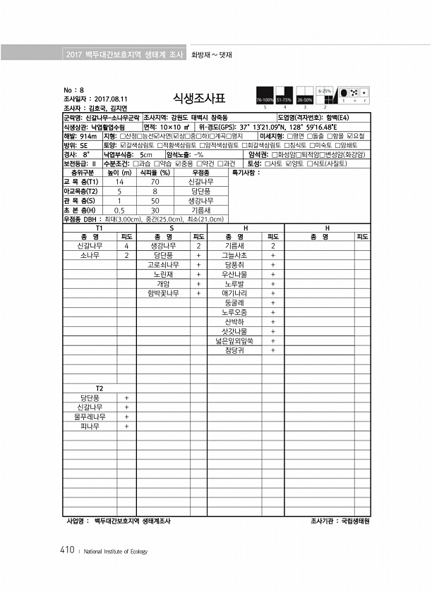 2017 백두대간보호지역 생태계 조사 화방재 댓재 410 ? National Institute of Ecology No 8 조사일자 2017.08.11 조사자 김호국, 김지연 식생조사표 군락명신갈나무-소나무군락 조사지역강원도 태백시 창죽동 도엽명 격자번호 함백 E4 식생상관낙엽활엽수림 면적10×10 ㎡ 위·경도 GPS 37°1321.09N, 128°5916.48E 해발914m 지형□산정□능선?사면 ?상□중□하 □계곡□평지 미세지형□평면 □돌출 □함몰 ?요철 방위SE 토양?갈색삼림토 □적황색삼림토 □암적색삼림토 □회갈색삼림토 □침식토 □미숙토 □암쇄토 경사8° 낙엽부식층5cm 암석노출-% 암석권□화성암□퇴적암□변성암 화강암 보전등급Ⅱ 수분조건□과습 □약습 ?중용 □약건 □과건 토성□사토 ?양토 □식토 사질토 ...