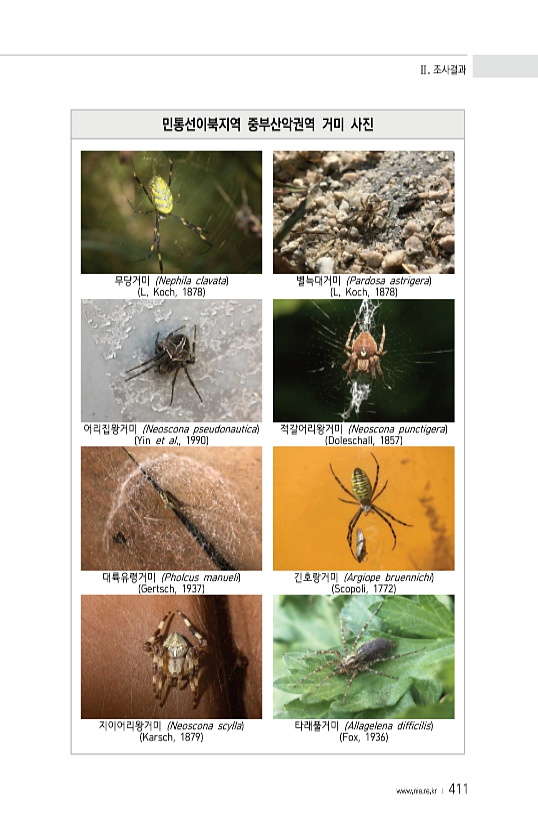Ⅱ. 조사결과 www.nie.re.kr ? 411 민통선이북지역 중부산악권역 거미 사진 무당거미 Nephila clavata L. Koch, 1878 별늑대거미 Pardosa astrigera L. Koch, 1878 어리집왕거미 Neoscona pseudonautica Yin et al., 1990 적갈어리왕거미 Neoscona punctigera Doleschall, 1857 대륙유령거미 Pholcus manueli Gertsch, 1937 긴호랑거미 Argiope bruennichi Scopoli, 1772 지이어리왕거미 Neoscona scylla Karsch, 1879 타래풀거미 Allagelena difficilis Fox, 1936