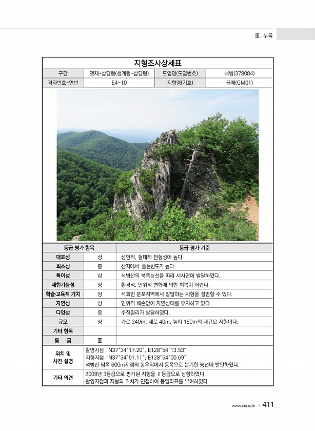 Ⅲ. 부록 www.nie.re.kr ? 411 지형조사상세표 구간 댓재삽당령 생계령삽당령 도엽명 도엽번호 석병 378084 격자번호-연번 E4-10 지형명 기호 급애 GM01 등급 평가 항목 등급 평가 기준 대표성 상 성인적, 형태적 전형성이 높다. 희소성 중 산지에서 출현빈도가 높다. 특이성 상 석병산의 북쪽능선을 따라 서사면에 발달하였다. 재현가능성 상 환경적, 인위적 변화에 의한 회복이 어렵다. 학술?교육적 가치 상 석회암 분포지역에서 발달하는 지형을 설명할 수 있다. 자연성 상 인위적 훼손없이 자연상태를 유지하고 있다. 다양성 중 수직절리가 발달하였다. 규모 상 가로 240m, 세로 40m, 높이 150m의 대규모 지형이다. 기타 항목 등 급 Ⅱ 위치 및 사진 설명 촬영지점 N37°34′17.20″,...