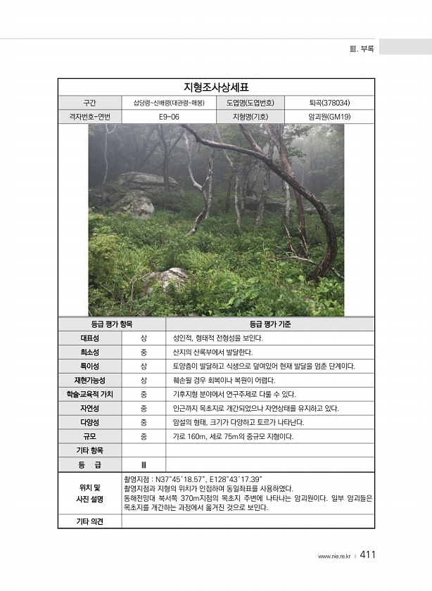 Ⅲ. 부록 www.nie.re.kr ? 411 지형조사상세표 구간 삽당령신배령 대관령매봉 도엽명 도엽번호 퇴곡 378034 격자번호-연번 E9-06 지형명 기호 암괴원 GM19 등급 평가 항목 등급 평가 기준 대표성 상 성인적, 형태적 전형성을 보인다. 희소성 중 산지의 산록부에서 발달한다. 특이성 상 토양층이 발달하고 식생으로 덮여있어 현재 발달을 멈춘 단계이다. 재현가능성 상 훼손될 경우 회복이나 복원이 어렵다. 학술?교육적 가치 중 기후지형 분야에서 연구주제로 다룰 수 있다. 자연성 중 인근까지 목초지로 개간되었으나 자연상태를 유지하고 있다. 다양성 중 암설의 형태, 크기가 다양하고 토르가 나타난다. 규모 중 가로 160m, 세로 75m의 중규모 지형이다. 기타 항목 등 급 Ⅲ 위치 및 사진 설명 촬영...