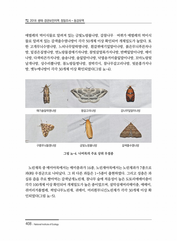 2018 생태·경관보전지역 정밀조사 동강유역 408 ? National Institute of Ecology 애벌레의 먹이식물로 알려져 있는 금빛노랑불나방, 갈참나무?여뀌가 애벌레의 먹이식 물로 알려져 있는 갈색줄수염나방이 각각 50개체 이상 확인되어 개체밀도가 높았다. 또 한 고개무늬수염나방, 느티나무알락명나방, 흰갈퀴애기잎말이나방, 붉은무늬푸른자나 방, 밑검은집명나방, 연노랑물결애기자나방, 참빗살얼룩가지나방, 반백잎말이나방, 매미 나방, 다색띠큰가지나방, 솔송나방, 솔잎말이나방, 낙엽송거미줄잎말이나방, 꼬마노랑뒷 날개나방, 상수리뿔나방, 몸노랑들명나방, 점박각시, 참나무갈고리나방, 뒷분홍가지나 방, 멧누에나방이 각각 30개체 이상 확인되었다 그림 ⅸ-4 애기솔알락명나방 왕갈고리나방 감나무잎말이나방 구름무...
