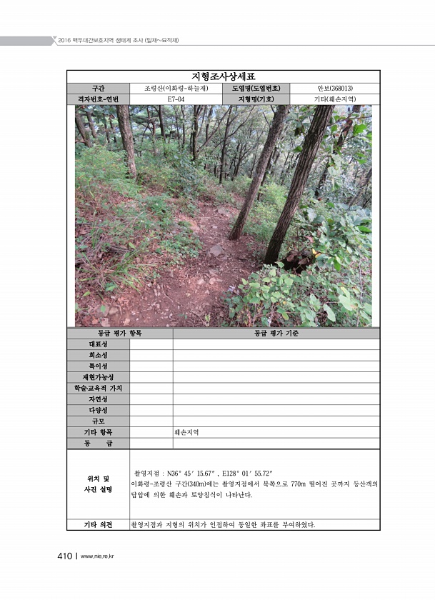 2016 백두대간보호지역 생태계 조사 밀재묘적재 410Ⅰwww.nie.re.kr 지형조사상세표 구간 조령산 이화령-하늘재 도엽명 도엽번호 안보 368013 격자번호-연번 E7-04 지형명 기호 기타 훼손지역 등급 평가 항목 등급 평가 기준 대표성 희소성 특이성 재현가능성 학술?교육적 가치 자연성 다양성 규모 기타 항목 훼손지역 등 급 위치 및 사진 설명 촬영지점 N36° 45′ 15.67″ , E128° 01′ 55.72″ 이화령조령산 구간 340m 에는 촬영지점에서 북쪽으로 770m 떨어진 곳까지 등산객의 답압에 의한 훼손과 토양침식이 나타난다. 기타 의견 촬영지점과 지형의 위치가 인접하여 동일한 좌표를부여하였다.