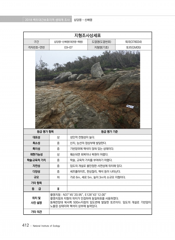 2018 백두대간보호지역 생태계 조사 삽당령 신배령 412 ? National Institute of Ecology 지형조사상세표 구간 삽당령신배령 대관령매봉 도엽명 도엽번호 퇴곡 378034 격자번호-연번 E9-07 지형명 기호 토르 GM05 등급 평가 항목 등급 평가 기준 대표성 상 성인적 전형성이 높다. 희소성 중 산지, 능선의 정상부에 발달한다. 특이성 중 기반암위에 핵석이 얹혀 있는 상태이다. 재현가능성 상 훼손되면 회복이나 복원이 어렵다. 학술?교육적 가치 중 학술, 교육적 가치를 부여하기 어렵다. 자연성 중 임도의 개설로 불안정한 사면상에 위치해 있다. 다양성 중 세프롤라이트, 판상절리, 핵석 등이 나타난다. 규모 하 가로 6m, 세로 5m, 높이 3m의 소규모 지형이다. 기타 항목 등 급 Ⅲ ...