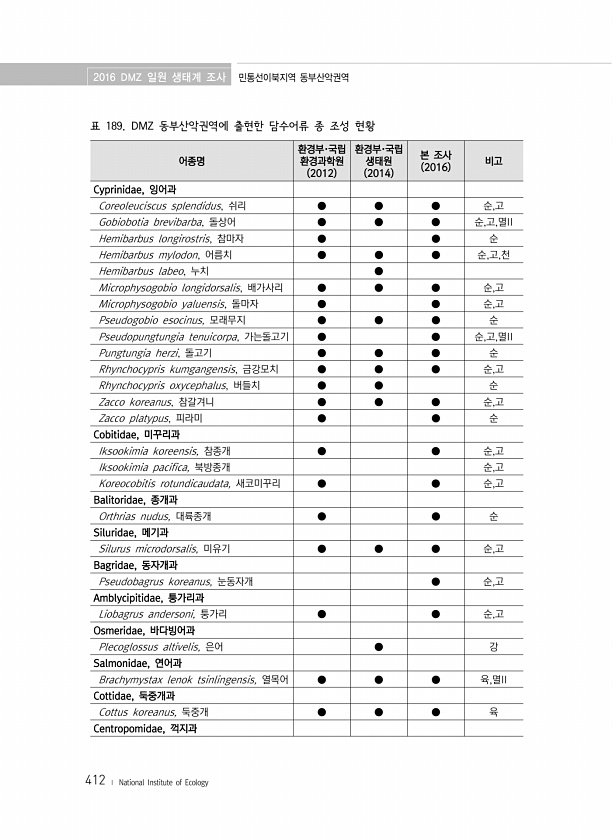 2016 DMZ 일원 생태계 조사 민통선이북지역 동부산악권역 412 ? National Institute of Ecology 어종명 환경부·국립 환경과학원 2012 환경부·국립 생태원 2014 본 조사 2016 비고 Cyprinidae, 잉어과 Coreoleuciscus splendidus, 쉬리 ● ● ● 순,고 Gobiobotia brevibarba, 돌상어 ● ● ● 순,고,멸II Hemibarbus longirostris, 참마자 ● ● 순 Hemibarbus mylodon, 어름치 ● ● ● 순,고,천 Hemibarbus labeo, 누치 ● Microphysogobio longidorsalis, 배가사리 ● ● ● 순,고 Microphysogobio yaluensis, 돌마자 ● ● 순,고 Pse...
