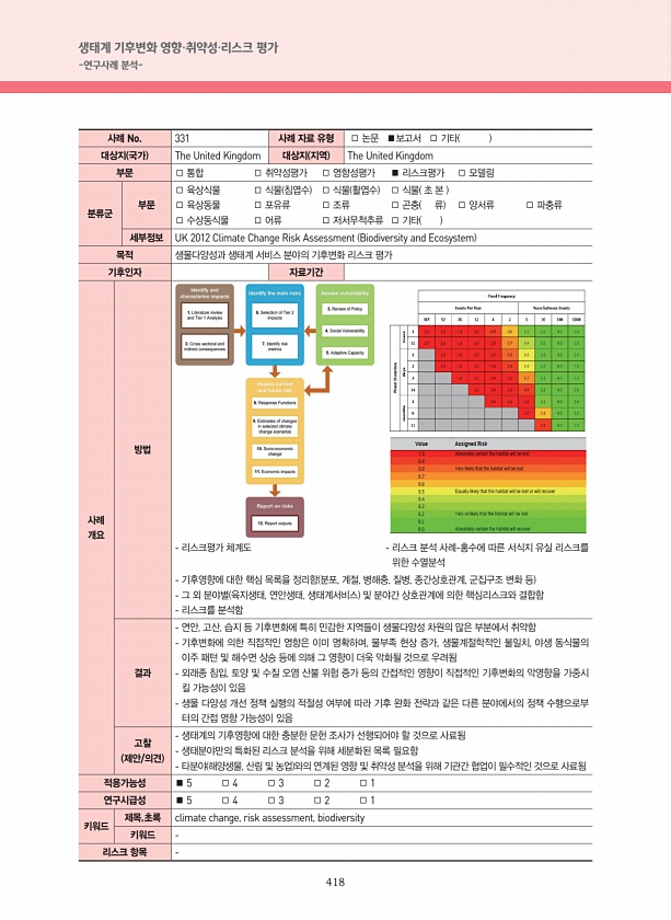 418 생태계 기후변화 영향·취약성·리스크 평가 -연구사례 분석- 사례 No. 331 사례 자료 유형 □ 논문 ■보고서 □ 기타 대상지 국가 The United Kingdom 대상지 지역 The United Kingdom 부문 □ 통합 □ 취약성평가 □ 영향성평가 ■ 리스크평가 □ 모델링 분류군 부문 □ 육상식물 □ 식물 침엽수 □ 식물 활엽수 □ 식물 초 본 □ 육상동물 □ 포유류 □ 조류 □ 곤충 류 □ 양서류 □ 파충류 □ 수상동식물 □ 어류 □ 저서무척추류 □ 기타 세부정보 UK 2012 Climate Change Risk Assessment Biodiversity and Ecosystem 목적 생물다양성과 생태계 서비스 분야의 기후변화 리스크 평가 기후인자 자료기간 사례 개요 방법 리스크평가 체계도...