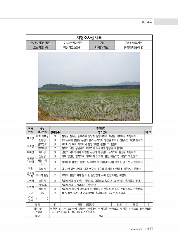 Ⅲ. 부록 www.nie.re.kr ? 411 지형조사상세표 조사지역 권역명 17-서부평야권역 구분 민통선이북지역 코스명 연번 덕산리코스 08 지형명 기호 용암대지 GV13 평가 항목 세부 평가항목 평가방법 평가점수 평가근거 비 고 대표성 지역 대표성 3 철원군 철원읍 중세리에 발달한 용암대지로 지역을 대표하는 지형이다. 전형성 3 오리산에서 분출된 용암이 흘러 누적되어 형성된 대지로 전형적인 화산지형이다. 희소성 분포빈도 3 우리나라 육지 지역에서 용암대지를 관찰하기 힘들다. 분포패턴 2 점도가 낮은 용암류가 흐르면서 누적되어 형성된 지형이다. 특이성 특이성 3 남한의 육지부에서 유일한 신생대 현무암이 누적되어 형성된 지형이다. 재현불 가능성 민감성 3 매우 단단한 암석으로 이루어져 있으며, 한번 훼손되면...