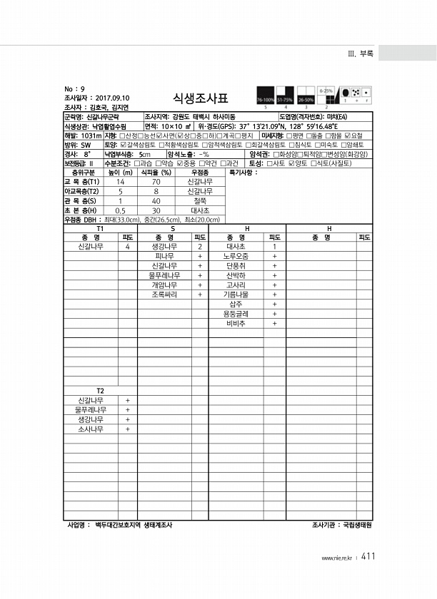 Ⅲ. 부록 www.nie.re.kr ? 411 No 9 조사일자 2017.09.10 조사자 김호국, 김지연 식생조사표 군락명신갈나무군락 조사지역강원도 태백시 하사미동 도엽명 격자번호 마차 E4 식생상관낙엽활엽수림 면적10×10 ㎡ 위·경도 GPS 37°1321.09N, 128°5916.48E 해발1031m 지형□산정□능선?사면 ?상□중□하 □계곡□평지 미세지형□평면 □돌출 □함몰 ?요철 방위SW 토양?갈색삼림토 □적황색삼림토 □암적색삼림토 □회갈색삼림토 □침식토 □미숙토 □암쇄토 경사8° 낙엽부식층5cm 암석노출-% 암석권□화성암□퇴적암□변성암 화강암 보전등급Ⅱ 수분조건□과습 □약습 ?중용 □약건 □과건 토성□사토 ?양토 □식토 사질토 층위구분 높이 m 식피율 % 우점종 특기사항 교 목 층 T1 14 70 ...