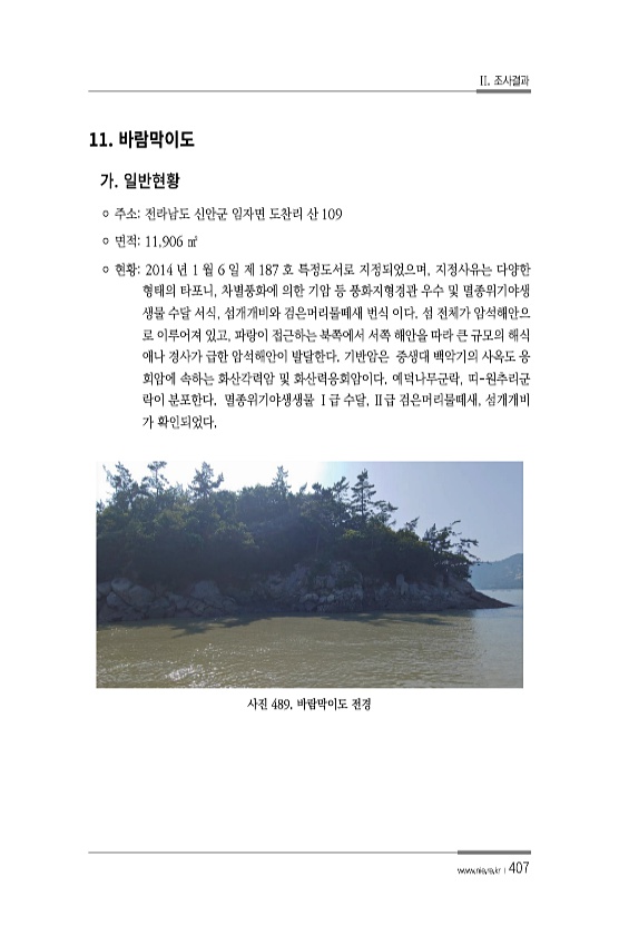 II. 조사결과 www.nie.re.kr ?407 11. ? 주소전라남도 신안군 임자면 도찬리 산 109 ? 면적11,906 ㎡ ? 현황2014 년 1 월 6 일 제 187 호 특정도서로 지정되었으며, 지정사유는 다양한 형태의 타포니, 차별풍화에 의한 기암 등 풍화지형경관 우수 및 멸종위기야생 생물 수달 서식, 섬개개비와 검은머리물떼새 번식 이다. 섬 전체가 암석해안으 로 이루어져 있고, 파랑이 접근하는 북쪽에서 서쪽 해안을 따라 큰 규모의 해식 애나 경사가 급한 암석해안이 발달한다. 기반암은 중생대 백악기의 사옥도 응 회암에 속하는 화산각력암 및 화산력응회암이다. 예덕나무군락, 띠-원추리군 락이 분포한다. 멸종위기야생생물 Ⅰ급 수달, Ⅱ급 검은머리물떼새, 섬개개비 가 확인되었다. 사진 489. 바람막이도전...