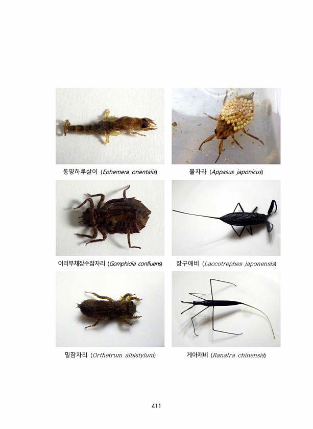 411 동양하루살이 Ephemera orientalis 물자라 Appasus japonicus 어리부채장수잠자리 Gomphidia confluens 장구애비 Laccotrephes japonensis 밀잠자리 Orthetrum albistylum 게아재비 Ranatra chinensis