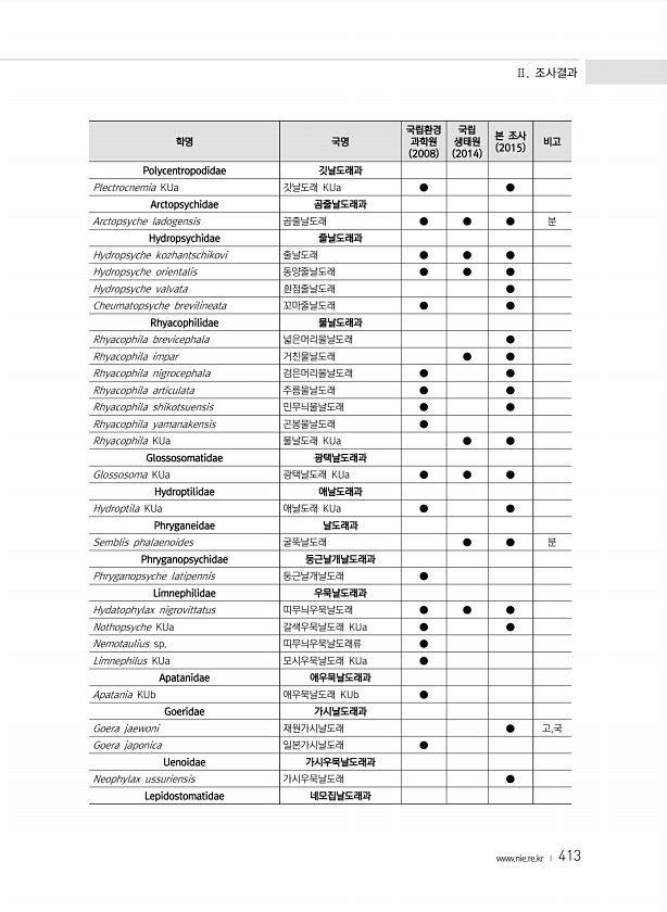 Ⅱ. 조사결과 www.nie.re.kr ? 413 학명 국명 국립환경 과학원 2008 국립 생태원 2014 본 조사 2015 비고 Polycentropodidae 깃날도래과 Plectrocnemia KUa 깃날도래 KUa ● ● Arctopsychidae 곰줄날도래과 Arctopsyche ladogensis 곰줄날도래 ● ● ● 분 Hydropsychidae 줄날도래과 Hydropsyche kozhantschikovi 줄날도래 ● ● ● Hydropsyche orientalis 동양줄날도래 ● ● ● Hydropsyche valvata 흰점줄날도래 ● Cheumatopsyche brevilineata 꼬마줄날도래 ● ● Rhyacophilidae 물날도래과 Rhyacophila brevicephala 넓은머...