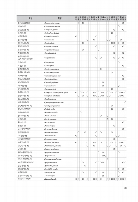421 붉은금무늬밤나방 Chrysodeixis eriosoma ○ ○ ○ 사랑밤나방 Chrysorithrum amatum ○ 흰점멧수염나방 Cidariplura gladiata ○ ○ 푸른밤나방 Clethrophora distincta ○ 세줄짤름나방 Colobochyla salicalis ○ ○ ○ 털보버짐나방 Colocasia mus ○ ○ ○ ○ ○ 희미무늬밤나방 Condica illecta ○ ○ ○ ○ ○ 흰점꼬마밤나방 Corgatha argillacea ○ ○ ○ 분홍꼬마밤나방 Corgatha costimacula ○ ○ 흰줄꼬마밤나방 Corgatha dictaria ○ ○ 붉은꼬마밤나방 소루쟁이거세미나방 Corgatha nitens ○ ○ ○ ○ ○ 잔줄밤나방 Corsa petrina ○ 느릅밤...