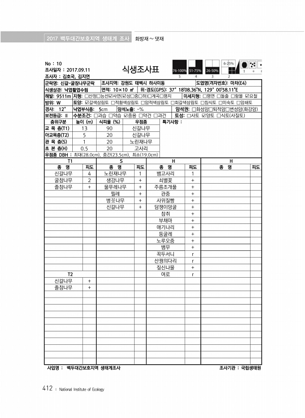 2017 백두대간보호지역 생태계 조사 화방재 댓재 412 ? National Institute of Ecology No 10 조사일자 2017.09.11 조사자 김호국, 김지연 식생조사표 군락명신갈-굴참나무군락 조사지역강원도 태백시 하사미동 도엽명 격자번호 마차 E4 식생상관낙엽활엽수림 면적10×10 ㎡ 위·경도 GPS 37°1808.36N, 129°0058.11E 해발9511m 지형□산정□능선?사면 ?상□중□하 □계곡□평지 미세지형□평면 □돌출 □함몰 ?요철 방위W 토양?갈색삼림토 □적황색삼림토 □암적색삼림토 □회갈색삼림토 □침식토 □미숙토 □암쇄토 경사12° 낙엽부식층5cm 암석노출-% 암석권□화성암□퇴적암□변성암 화강암 보전등급Ⅱ 수분조건□과습 □약습 ?중용 □약건 □과건 토성□사토 ?양토 □식토 사질...