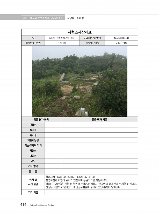 2018 백두대간보호지역 생태계 조사 삽당령 신배령 414 ? National Institute of Ecology 지형조사상세표 구간 삽당령신배령 대관령매봉 도엽명 도엽번호 퇴곡 378034 격자번호-연번 E9-09 지형명 기호 기타 산정 등급 평가 항목 등급 평가 기준 대표성 희소성 특이성 재현가능성 학술?교육적 가치 자연성 다양성 규모 기타 항목 등 급 위치 및 사진 설명 촬영지점 N37°45′53.82″, E128°42′41.46″ 촬영지점과 지형의 위치가 인접하여 동일좌표를 사용하였다. 매봉 1,170m 은 강원 평창군 대관령면과 강릉시 연곡면의 경계면에 위치한 산정이다. 산정은 식생으로 덮여있으며 인공시설물이 들어서 있던 흔적이 남아있다. 기타의견