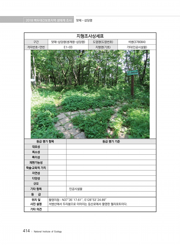 2018 백두대간보호지역 생태계 조사 댓재 삽당령 414 ? National Institute of Ecology 지형조사상세표 구간 댓재삽당령 생계령삽당령 도엽명 도엽번호 석병 378084 격자번호-연번 E1-03 지형명 기호 기타 인공시설물 등급 평가 항목 등급 평가 기준 대표성 희소성 특이성 재현가능성 학술?교육적 가치 자연성 다양성 규모 기타 항목 인공시설물 등 급 위치 및 사진 설명 촬영지점 N37°35′17.61″, E128°53′24.89″ 석병산에서 두리봉으로 이어지는 등산로에서 촬영한 헬리포트이다. 기타의견