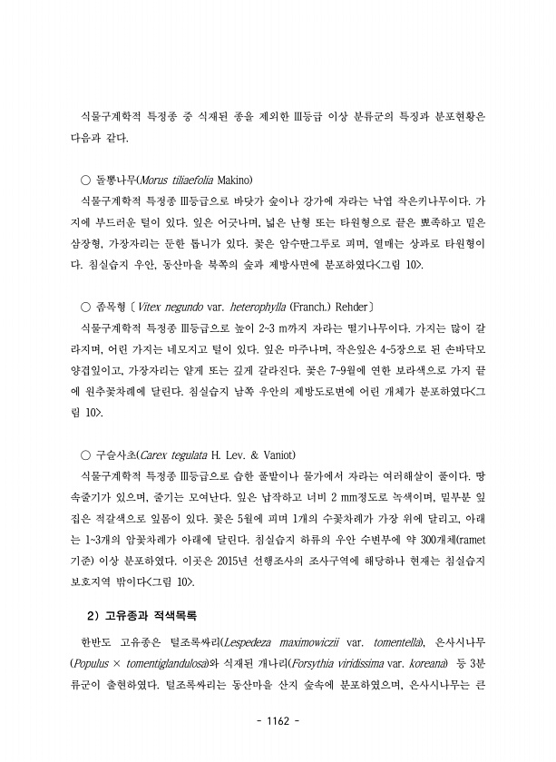 1162 식물구계학적 특정종 중 식재된 종을 제외한 III등급 이상 분류군의 특징과 분포현황은 다음과 같다. ○ 돌뽕나무 Morus tiliaefolia Makino 식물구계학적 특정종 III등급으로 바닷가 숲이나 강가에 자라는 낙엽 작은키나무이다. 가 지에 부드러운 털이 있다. 잎은 어긋나며, 넓은 난형 또는 타원형으로 끝은 뾰족하고 밑은 삼장형, 가장자리는 둔한 톱니가 있다. 꽃은 암수딴그루로 피며, 열매는 상과로 타원형이 다. 침실습지 우안, 동산마을 북쪽의 숲과 제방사면에 분포하였다 그림 10 ○ 좀목형〔Vitex negundo var. heterophylla Franch. Rehder〕 식물구계학적 특정종 III등급으로 높이 23 m까지 자라는 떨기나무이다. 가지는 많이 갈 라지며, 어린 가지는 네...