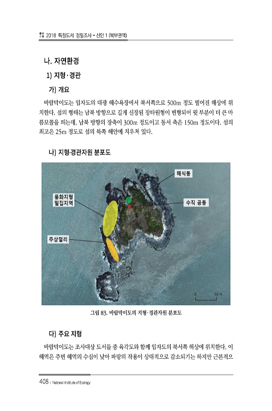 2018 특정도서 정밀조사 신안 1 북부권역 408 ? National Institute of Ecology 1 · 바람막이도는 임자도의 대광 해수욕장에서 북서쪽으로 500m 정도 떨어진 해상에 위 치한다. 섬의 형태는 남북 방향으로 길게 신장된 장타원형이 변형되어 윗 부분이 더 큰 마 름모꼴을 띄는데, 남북 방향의 장축이 300m 정도이고 동서 축은 150m 정도이다. 섬의 최고은 25m 정도로 섬의 북쪽 해안에 치우쳐 있다. ? 그림 83. 바람막이도의 지형·경관자원 분포도 바람막이도는 조사대상 도서들 중 육각도와 함께 임자도의 북서쪽 해상에 위치한다. 이 해역은 주변 해역의 수심이 낮아 파랑의 작용이 상대적으로 감소되기는 하지만근본적으