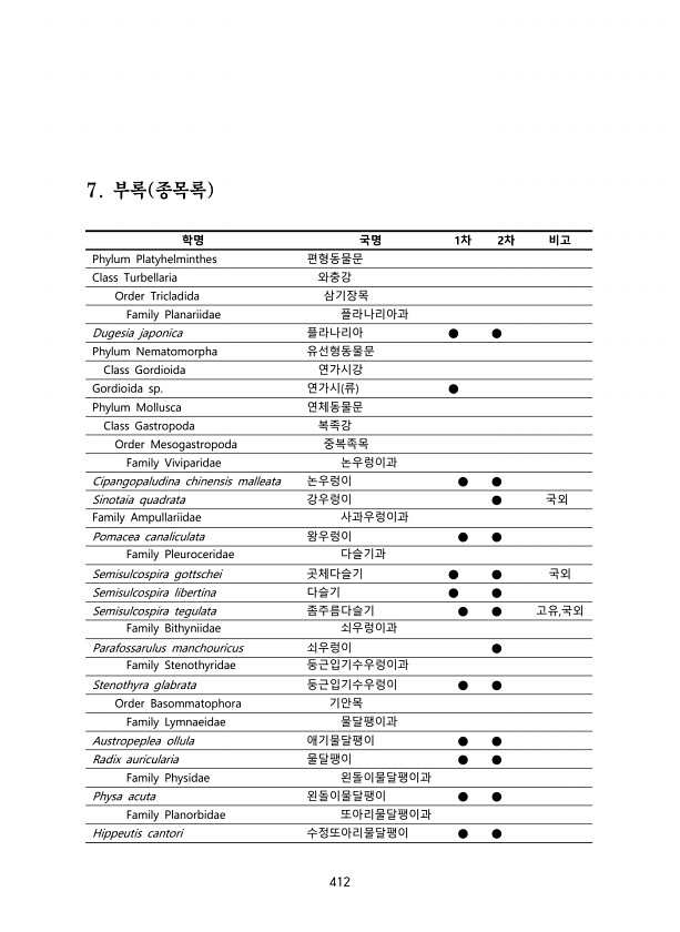 412 7. 부록 종목록 학명 국명 1차 2차 비고 Phylum Platyhelminthes 편형동물문 Class Turbellaria 와충강 Order Tricladida 삼기장목 Family Planariidae 플라나리아과 Dugesia japonica 플라나리아 ● ● Phylum Nematomorpha 유선형동물문 Class Gordioida 연가시강 Gordioida sp. 연가시 류 ● Phylum Mollusca 연체동물문 Class Gastropoda 복족강 Order Mesogastropoda 중복족목 Family Viviparidae 논우렁이과 Cipangopaludina chinensis malleata 논우렁이 ● ● Sinotaia quadrata 강우렁이 ● 국외 Family Am...