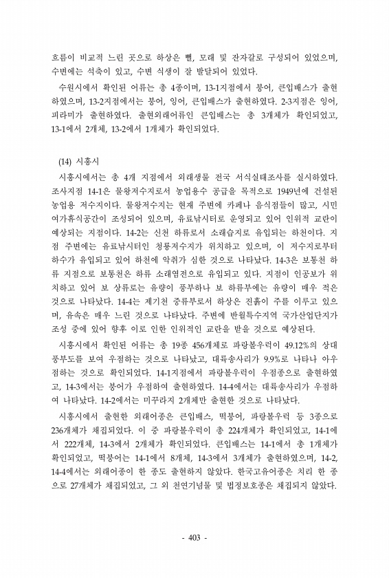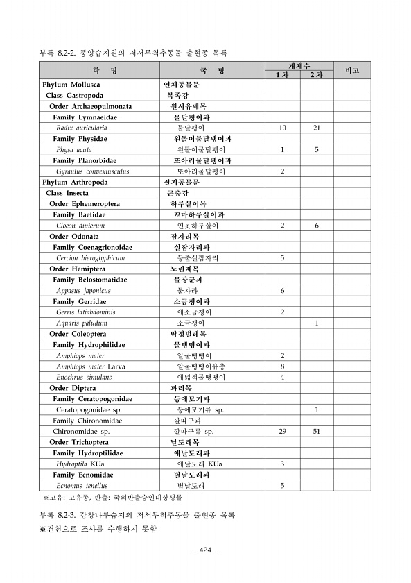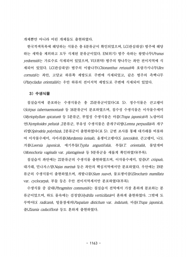 1163 개체뿐만 아니라 어린 개체들도 출현하였다. 한국적색목록에 해당하는 식물은 총 6분류군이 확인되었으며, LC 관심대상 범주에 해당 하는 새박을 제외하고 모두 식재된 분류군이었다. EN 위기 범주 속하는 왕벚나무 Prunus yedoensis 는 가로수로 식재되어 있었으며, VU 취약 범주의 향나무는 좌안 전이지역에 식 재되어 있었다. LC 관심대상 범주의 이팝나무 Chionanthus retusus 와 호랑가시나무 Ilex cornuta 는 좌안, 고달교 하류쪽 제방도로 주변에 식재되었고, 같은 범주의 측백나무 Platycladus orientalis 는 우안 하류의 전이지역 제방도로 주변에 식재되어 있었다. 3 수생식물 침실습지에 분포하는 수생식물은 총 25분류군이었다 표 5 정수식물은 큰고랭이 S...