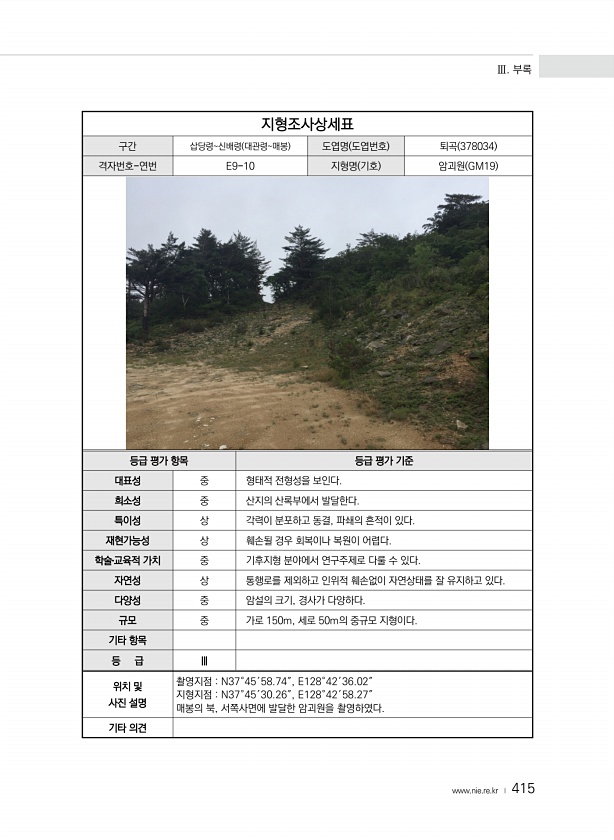 Ⅲ. 부록 www.nie.re.kr ? 415 지형조사상세표 구간 삽당령신배령 대관령매봉 도엽명 도엽번호 퇴곡 378034 격자번호-연번 E9-10 지형명 기호 암괴원 GM19 등급 평가 항목 등급 평가 기준 대표성 중 형태적 전형성을 보인다. 희소성 중 산지의 산록부에서 발달한다. 특이성 상 각력이 분포하고 동결, 파쇄의 흔적이 있다. 재현가능성 상 훼손될 경우 회복이나 복원이 어렵다. 학술?교육적 가치 중 기후지형 분야에서 연구주제로 다룰 수 있다. 자연성 상 통행로를 제외하고 인위적 훼손없이 자연상태를 잘 유지하고 있다. 다양성 중 암설의 크기, 경사가 다양하다. 규모 중 가로 150m, 세로 50m의 중규모 지형이다. 기타 항목 등 급 Ⅲ 위치 및 사진 설명 촬영지점 N37°45′58.74″, E12...