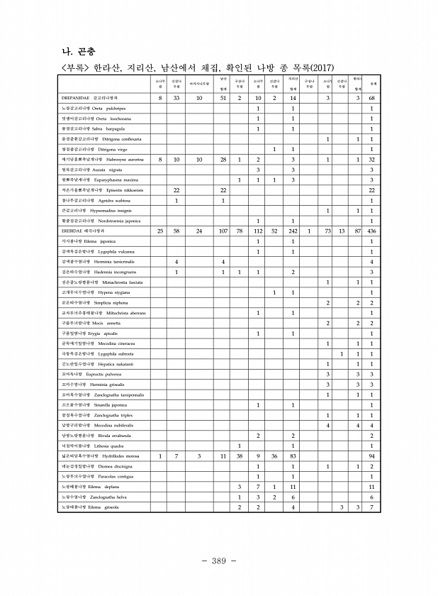389 나. 곤충 부록 한라산, 지리산, 남산에서 채집, 확인된 나방 종 목록 2017 소나무 림 신갈나 무림 아카시나무림 남산 합계 구상나 무림 소나무 림 신갈나 무림 지리산 합계 구상나 무림 소나무 림 신갈나 무림 한라산 합계 총계 DREPANIDAE 갈고리나방과 8 33 10 51 2 10 2 14 3 3 68 노랑갈고리나방 Oreta pulchripes 1 1 1 멋쟁이갈고리나방 Oreta loochooana 1 1 1 물결갈고리나방 Sabra harpagula 1 1 1 물결줄흰갈고리나방 Ditrigona conflexaria 1 1 1 쌍점줄갈고리나방 Ditrigona virgo 1 1 1 애기담홍뾰족날개나방 Habrosyne aurorina 8 10 10 28 1 2 3 1 1 32 얼룩갈고리나...
