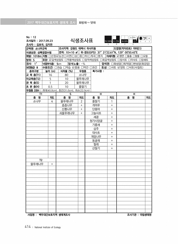 2017 백두대간보호지역 생태계 조사 화방재 댓재 414 ? National Institute of Ecology No 12 조사일자 2017.09.23 조사자 김호국, 김지연 식생조사표 군락명소나무군락 조사지역강원도 태백시 하사미동 도엽명 격자번호 마차 E1 식생상관상록침엽수림 면적10×10 ㎡ 위·경도 GPS 37°2122.61N, 129°0050.45E 해발1018m 지형□산정?능선□사면 □상□중□하 □계곡□평지 미세지형?평면 □돌출 □함몰 □요철 방위S 토양?갈색삼림토 □적황색삼림토 □암적색삼림토 □회갈색삼림토 □침식토 □미숙토 □암쇄토 경사1° 낙엽부식층5cm 암석노출-% 암석권□화성암□퇴적암□변성암 화강암 보전등급Ⅲ 수분조건□과습 □약습 ?중용 □약건 □과건 토성□사토 ?양토 □식토 사질토 층위구...