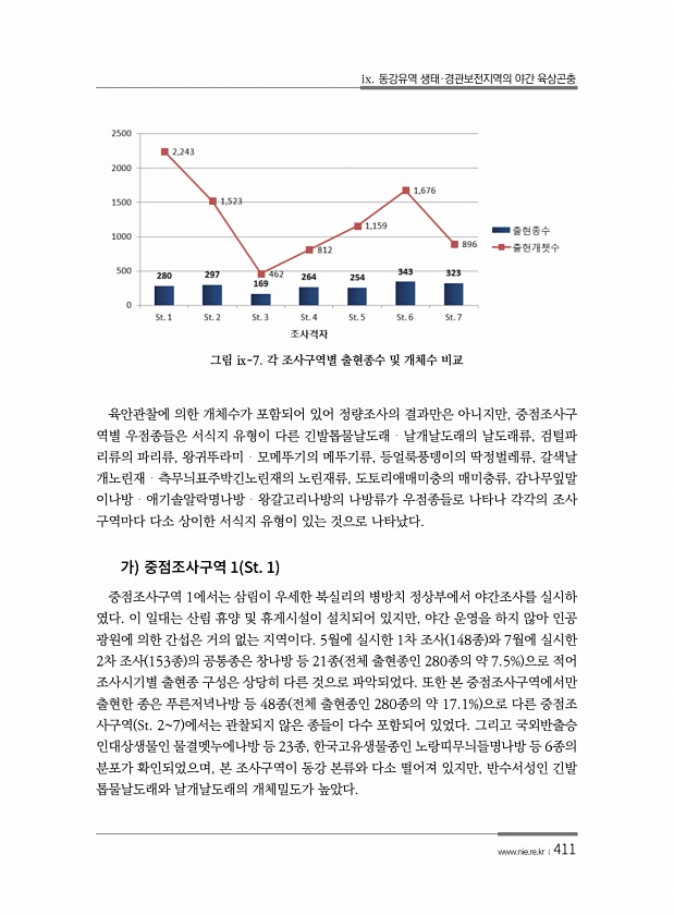ix. 동강유역 생태·경관보전지역의 야간 육상곤충 www.nie.re.kr ?411 그림 ⅸ-7. 각 조사구역별 출현종수 및 개체수 비교 육안관찰에 의한 개체수가 포함되어 있어 정량조사의 결과만은 아니지만, 중점조사구 역별 우점종들은 서식지 유형이 다른 긴발톱물날도래?날개날도래의 날도래류, 검털파 리류의 파리류, 왕귀뚜라미?모메뚜기의 메뚜기류, 등얼룩풍뎅이의 딱정벌레류, 갈색날 개노린재?측무늬표주박긴노린재의 노린재류, 도토리애매미충의 매미충류, 감나무잎말 이나방?애기솔알락명나방?왕갈고리나방의 나방류가 우점종들로 나타나 각각의 조사 구역마다 다소 상이한 서식지 유형이 있는 것으로 나타났다. 1 St. 1 중점조사구역 1에서는 삼림이 우세한 북실리의 병방치 정상부에서 야간조사를 실시하 였다. 이 일대는 산림 휴...