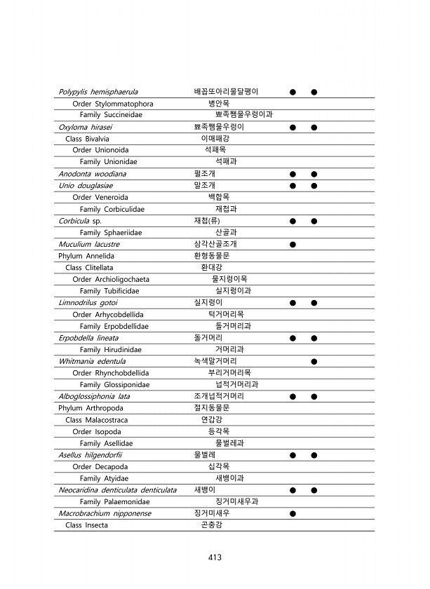 413 Polypylis hemisphaerula 배꼽또아리물달팽이 ● ● Order Stylommatophora 병안목 Family Succineidae 뾰족쨈물우렁이과 Oxyloma hirasei 뾰족쨈물우렁이 ● ● Class Bivalvia 이매패강 Order Unionoida 석패목 Family Unionidae 석패과 Anodonta woodiana 펄조개 ● ● Unio douglasiae 말조개 ● ● Order Veneroida 백합목 Family Corbiculidae 재첩과 Corbicula sp. 재첩 류 ● ● Family Sphaeriidae 산골과 Muculium lacustre 삼각산골조개 ● Phylum Annelida 환형동물문 Class Clitellata 환대강 Order...