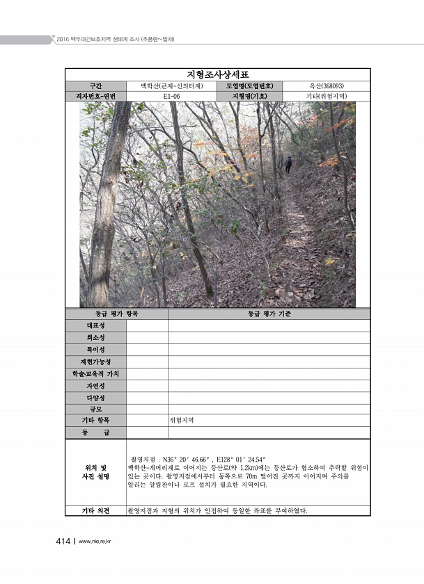 2016 백두대간보호지역 생태계 조사 추풍령밀재 414Ⅰwww.nie.re.kr 지형조사상세표 구간 백학산 큰재-신의터재 도엽명 도엽번호 옥산 368093 격자번호-연번 E1-06 지형명 기호 기타 위험지역 등급 평가 항목 등급 평가 기준 대표성 희소성 특이성 재현가능성 학술?교육적 가치 자연성 다양성 규모 기타 항목 위험지역 등 급 위치 및 사진 설명 촬영지점 N36° 20′ 46.66″ , E128° 01′ 24.54″ 백학산-개머리재로 이어지는 등산로 약 1.2km 에는 등산로가 협소하여 추락할 위험이 있는 곳이다. 촬영지점에서부터 동쪽으로 70m 떨어진 곳까지 이어지며 주의를 알리는 알림판이나 로프 설치가 필요한 지역이다. 기타 의견 촬영지점과 지형의 위치가 인접하여 동일한 좌표를부여하였다.