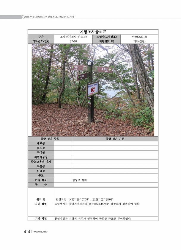 2016 백두대간보호지역 생태계 조사 밀재묘적재 414Ⅰwww.nie.re.kr 지형조사상세표 구간 조령산 이화령-하늘재 도엽명 도엽번호 안보 368013 격자번호-연번 E7-08 지형명 기호 기타 산정 등급 평가 항목 등급 평가 기준 대표성 희소성 특이성 재현가능성 학술?교육적 가치 자연성 다양성 규모 기타 항목 탐방로 설치 등 급 위치 및 사진 설명 촬영지점 N36° 46′ 07.39″ , E128° 02′ 28.05″ 조령샘에서 촬영지점까지의 등산로 280m 에는 탐방로가 설치되어 있다. 기타 의견 촬영지점과 지형의 위치가 인접하여 동일한 좌표를부여하였다.
